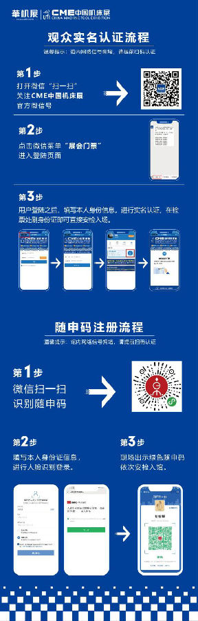 關(guān)注公眾號“華機(jī)展”、“CME國際機(jī)床展”,點擊左下角菜單“觀展資格”,登陸領(lǐng)取參觀資格,并進(jìn)行實名認(rèn)證,展會現(xiàn)場憑身份證+綠碼(健康碼)+口罩有序入場參觀。