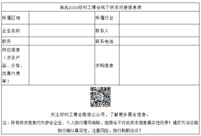鄭州工博會組委會將在2020年展會現場免費提供自主供求對接展示墻,所有到會參觀的企業均可在觀眾換證處免費領取供求對接信息表,并粘貼至現場供求展示墻,保證企業更大的收益,為中西部企業供需對接提供更便捷的服務!海名鄭州工博會讓供求對接更便捷!