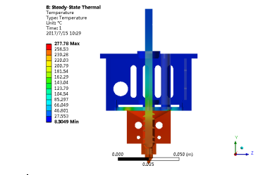 采用ANSYS Workbench對噴頭加熱和散熱模塊進行熱學(xué)分析[5],噴嘴、加熱塊材質(zhì)設(shè)置為黃銅,導(dǎo)熱系數(shù)為108.9W/(m*k),箱體和帶輪材質(zhì)為鋁合金,導(dǎo)熱系數(shù)為155W/(m*k);同步帶材質(zhì)為橡膠聚氨酯,導(dǎo)熱系數(shù)為25W/(m*k);螺桿材質(zhì)為不銹鋼,導(dǎo)熱系數(shù)16.2W/(m*k)。已知PET熔融溫度介于240~255℃之間,通過熱學(xué)分析得到最佳的加熱棒加熱溫度。通過設(shè)置不同加熱溫度進行分析,得出當(dāng)加熱棒溫度設(shè)置為270℃時,混合料筒內(nèi)部溫度達到250℃,處于PET的融化溫度區(qū)間。溫度分布云圖如圖3。