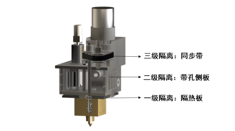 因而在本文中,我們主要設(shè)計的是如何做這種新型打印機的隔熱系統(tǒng)。首先介紹該新型打印機噴頭的機械結(jié)構(gòu),而后對該隔熱系統(tǒng)進行理論計算和仿真分析,最后是實物測試。