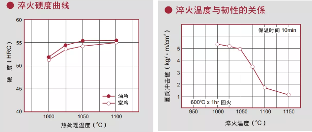 從以上的圖線可知,材料要求硬度越高,則淬火的溫度就越高,韌性越低,回火的溫度也越低。