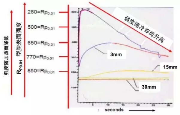 生產中,溫度升高主要來源于壓鑄液體的熱量及填充動能轉變成的熱能。所以,料液溫度過高和填充速度過快,都會引起型腔表面的熱強度降低。從而加快了材料的沖蝕、粘模、龜裂等讓模具失效的狀況出現。因此,在保證壓鑄產品質量的前提下,盡量采用相對低溫的料液和慢速填充,是延長模具壽命的有效方法。