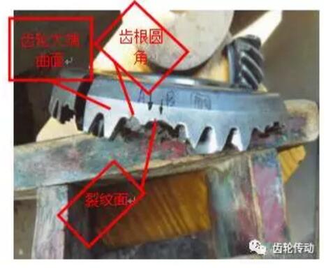 斷裂部位:中間偏大端,距小端約5mm左右的位置,其中有1齒在大端齒根圓角處斷裂。斷至齒根