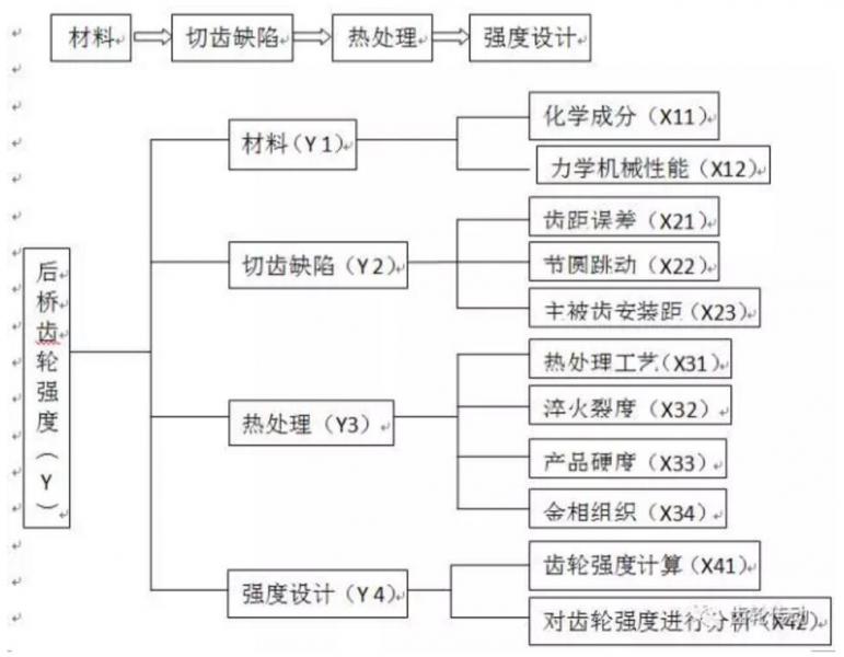 斷齒是齒輪最嚴重的失效形式,失效后,齒輪的傳動功能喪失,后橋不能實現力矩的傳動,車輛不能正常行駛,容易發生事故造成人身傷害,為此對該后橋齒輪打齒問題進行立項運用《質量工具》分析。