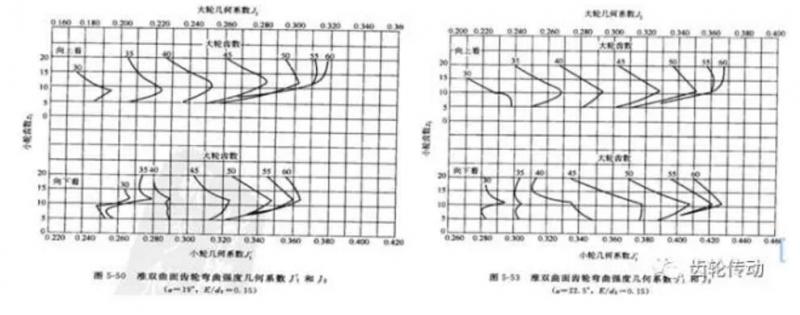 通過觀察《齒輪彎曲強度幾何系數線圖》(如下圖)發現,對于同樣的主動齒數(10),被動齒輪幾何系數 J2隨齒輪壓力角的增大而增大。由此可知,增大齒輪壓力角可以減小齒輪的計算齒根應力ϬF ,進而增大齒輪的彎曲強度。