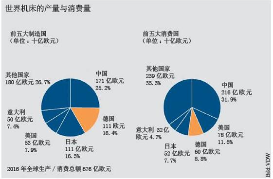 中國以216億歐元的消費總量,目前成為機床產品的最大消費國(產量減去出口量加上進口量)。德國機床產品全球出口冠軍