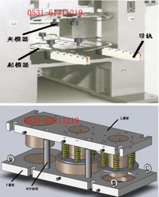 主機外安裝導軌,主機內安裝彈簧起模器。拆換模具時松開夾模器,彈簧起模器頂升,與主機外導軌在同一水平線上,用人力可輕快的將上下模架(包括磨具)拉出,在主機外導軌上吊走。另一備好的待換模具模架,可由行車吊裝降落在主機外導軌上,用人力可輕快的將模具推入機臺內,如此便實現了模具快速進出工作臺。